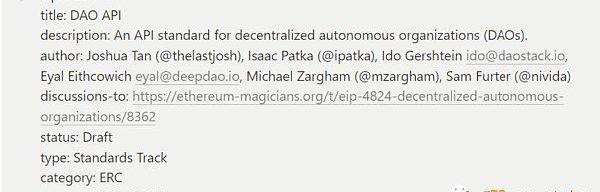 Metagov尝试为DAO创立一种统一的标准。其想法是设立一种“类似于ERC-721tokenURI那样的标准”。他们将这种标准定义为“EIP-4824”,用代码将DAO的基本结构、成员系统、提案系统、活动记录等模块都做成了JSON-LDSCHEMA这样的代码文件。(https://daostar.one/EIP)