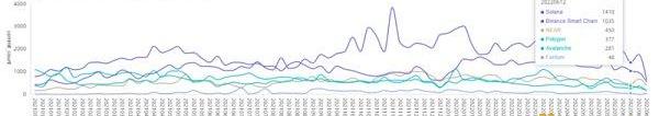 BSC和Polygon从去年一季度起势,高点在5月前后,随后就呈现下降趋势,BSC后续的项目不少,但开发者流失明显;