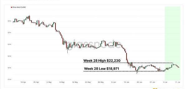 随着市场消化了6月份的极端下行波动,比特币价格本周继续在2万美元左右的范围内盘整。交易价格走高,以18,971美元的周低点开盘,并在22,230美元处达到峰值。