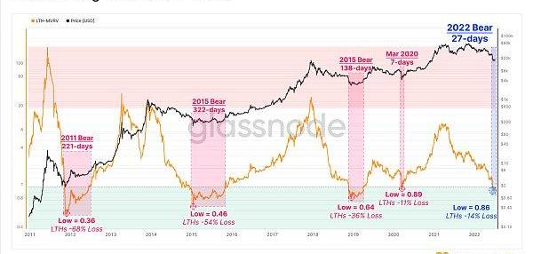 LTH-SOPR的当前值为0.67,LTH成本基础为2.23万美元,这意味着LTH支出每枚代币平均实现33%的损失,尽管现货价格仅比其成本基础低约6%。这表明以高价获得代币的LTH是目前的主要支出者,而那些仍然持有2017-20周期的代币的人,在很大程度上还在观望。