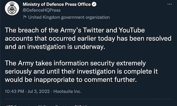 目前英国陆军已证实其推特和YouTube账户“遭到破坏”。