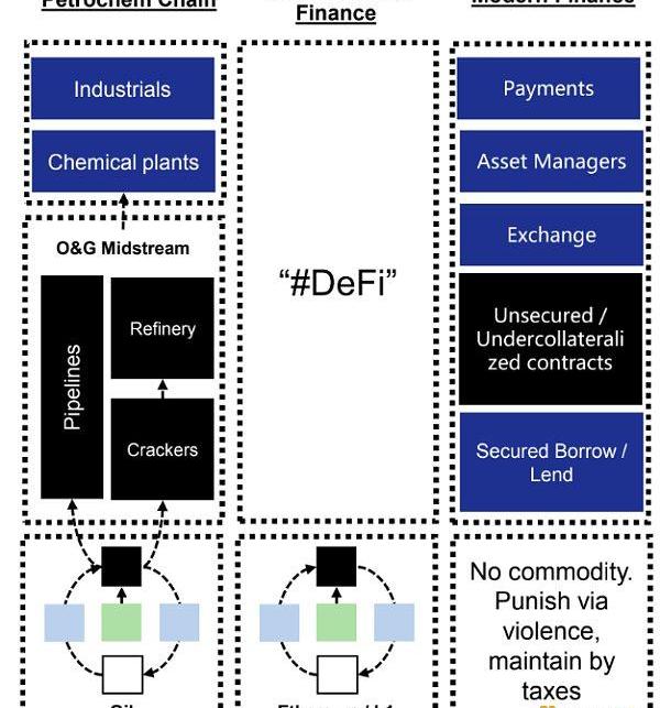 JasonKam?有一个很好的思维框架来思考这个问题,在2020年DeFiSummer,他提出了一个相当有意义的问题——如果ETH类似于构建石化价值链的能源商品,那么“是投资石油好还是石化/产业链股票好?”
