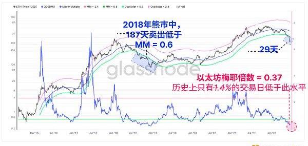 历史上只有大约10%的交易日中,梅耶倍数低于0.6。在2018年的熊市中,ETH在价格走势最差的时候,有187天低于这个区间。在目前的市场上,ETH自6月初以来一直在这个区间以下交易,现在已经在这个区间以下已经持续了29天。