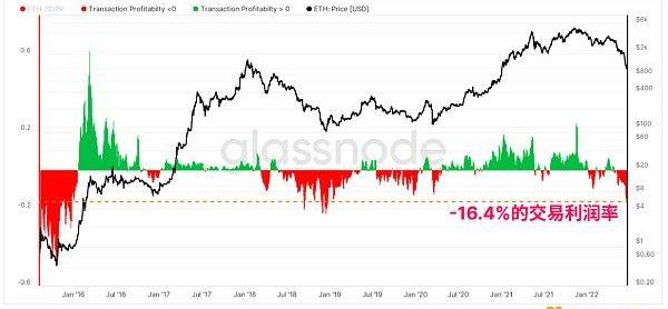 在熊市中,伴随着下行价格走势,已实现亏损占了主导地位。在目前的市场上,平均每位交易商在他们卖出的以太坊上实现了-16.4%的损失。这种糟糕的交易盈利能力上一次出现在2018年熊市的深处,当时以太坊的交易价格是84美元。