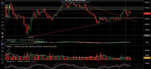 以太坊昨日在1180附近承压回落,低位跌至1075一线,恭喜跟上的朋友空单获利100点,晚间止跌再次反弹测试1180压力位置未能突破走出m顶而回落,目前币价在1120附近震荡,四小时级别布林带上轨受压k线连阴回落,MACD多头缩量,KDJ三线死叉向下延伸,目前需要关注的依旧是1180压力位置,一小时级别中轨压制突破不了将继续下行,日内思路依旧高空为主,上方压力1150-1180,下方支撑1085-1055