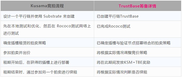 根据Kusama插槽竞拍的执行流程,TrustBase已上传平行链代码,完成在Rococo测试网络上的测试,确定了插槽竞拍与验证节点招募结合的拍卖策略。万事俱备,静待Kusama官方正式启动插槽竞拍。
