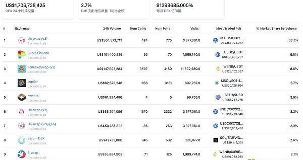 2.过去24小时去中心化交易所的交易量:17.06亿美元