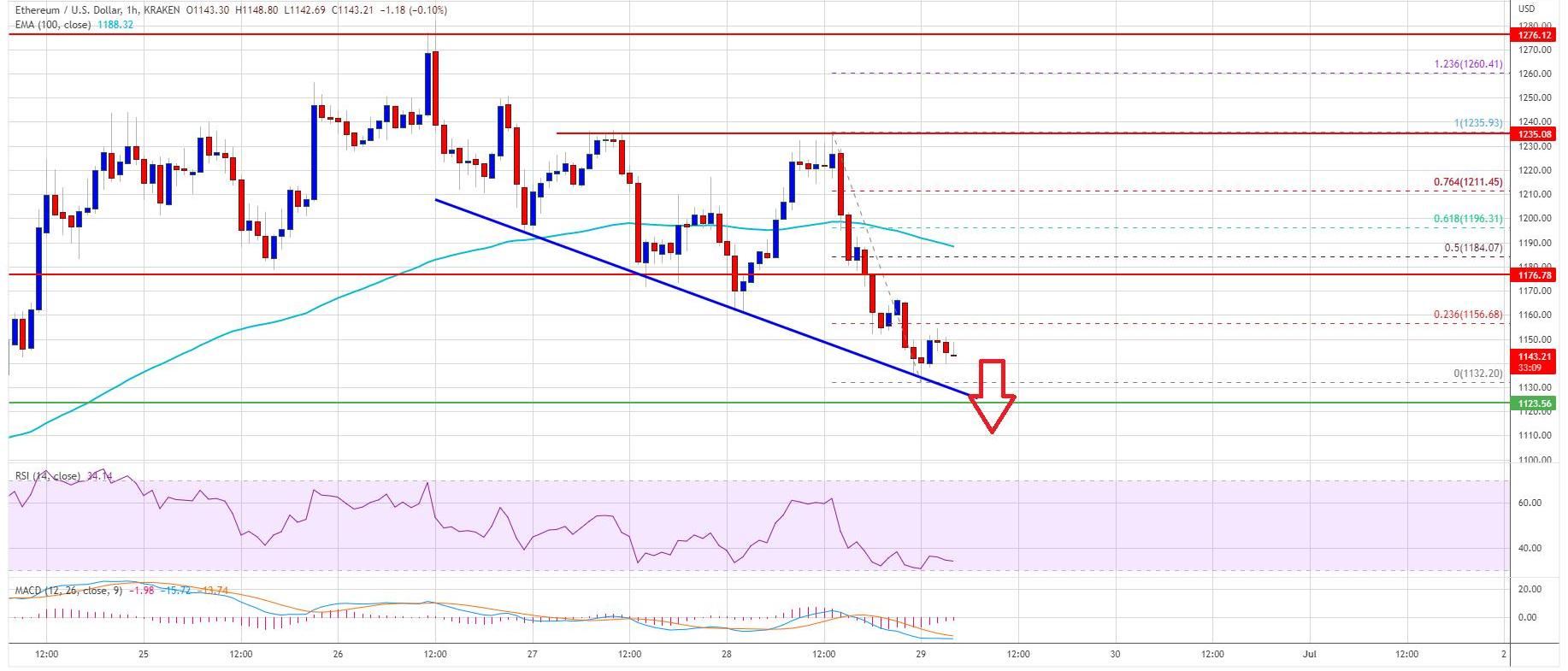 以太坊兑美元汇率跌破1,150美元区域。如果ETH低于关键的1,200美元支点区域,那么它现在面临更多损失的风险。