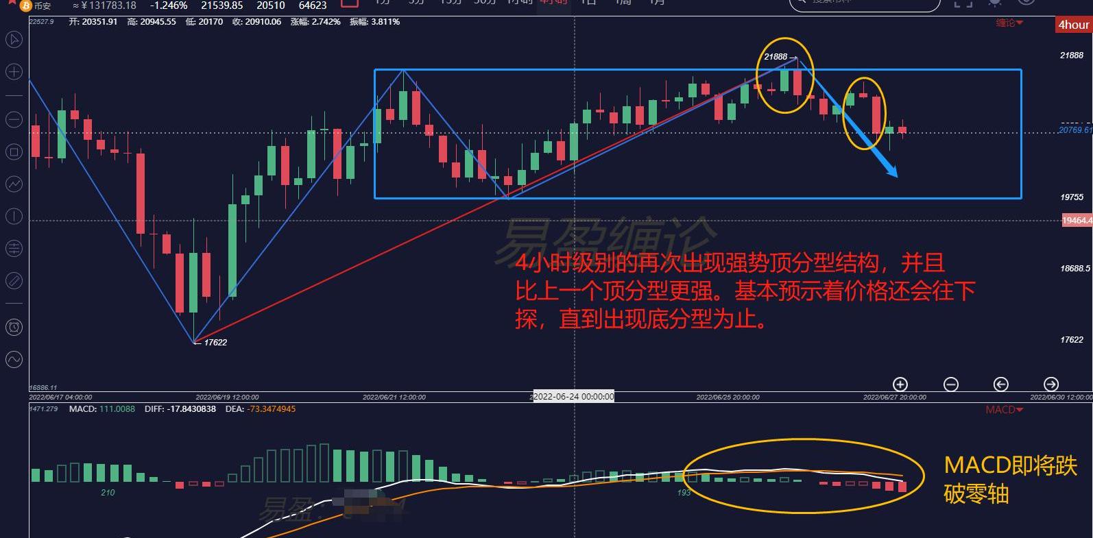 4小时图看,昨天再次出现强势顶分型结构,甚至比上一个顶分型更强。昨天的4小时一根大阴线比上次的还要长。如果MACD站不稳并下穿零轴,向下空间将会被打开。当然一切以缠论结构为准,不能主观去臆想未来走势一定会如何,因为这是不究竟的!