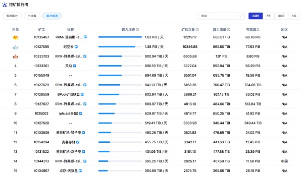 挖矿排行榜(算力增速),数据来源:https://filfox.info/zh