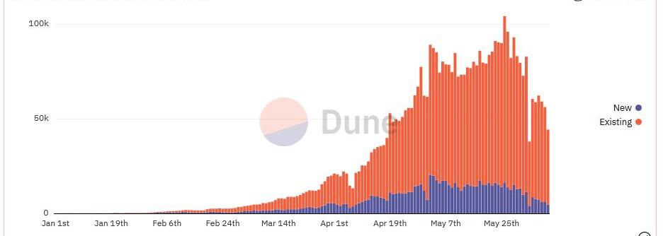 一轮是Solana上的爆发,3月初到4月末,增长曲线从平缓到陡坡。50天内,玩家账户从总数1万增长到日增过万,总量从1万到30万,实现了圈内爆发和初步出圈。这一轮基本没有失控,仅仅是最后几天出现了异像。