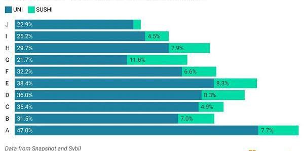100万以下的钱包在SUSHI中拥有41.5%的投票权,而Uniswap只有5.3%。