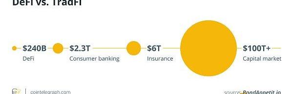 全球TradFi资本市场价值约100万亿美元,是目前锁定在DeFi协议中的200多亿美元的500倍。