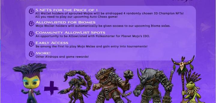 在游戏在夏季提前发布之前,已经萌发了Moj种子的Mojo持有者将自动随机空投最初的6个冠军中的4个!需要明确的是,通过铸造并持有1个Mojo,您将免费空投4个NFTS!您将以1的价格收到5个NFT!