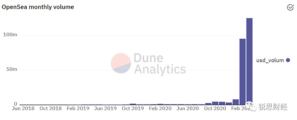 NFT 的圈子正在迅速扩大,拿 NFT 最大交易平台 OpenSea 的交易额举例,2020年8月是93.7万美元,2021年1月是804万美元,紧接着2月成交量暴涨到9390万美元,3月是1.25亿美元。仅仅半年,交易额暴涨133倍!