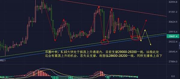 近期走势明显处于29000-200支撑上方震荡,大饼支撑点从26600抬高至28000,到今天的29000一线,大饼在低位盘整中的确是支撑在逐步上移,这是个震荡上行通道支撑,虽然以太与大饼有一定的背离,暂且处于震荡下行通道内,但对于大支撑而言,不破不立!破位跟随;