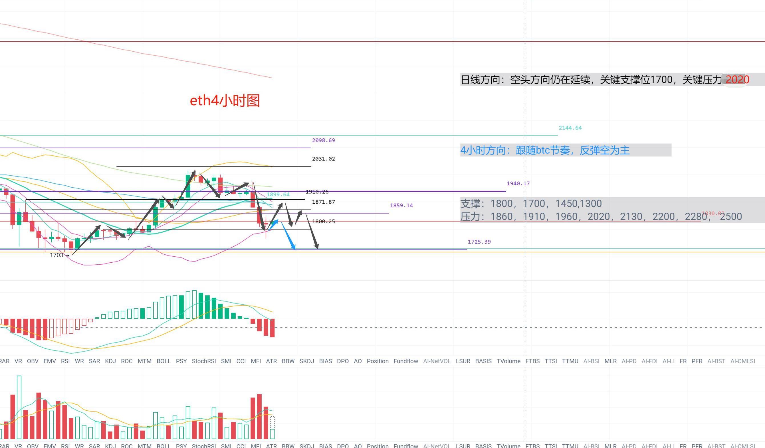 ETH短线支撑1750-1800美元,短线压力1900-1950美元。以太坊整体走势还是跟随大饼回调,跌破1900美元关键支撑,建议按照大饼节奏按照。主流币跟随大饼波动,按照大饼节奏操作。