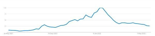 出现这种下降的另一个重要指标是“趋势”的变化,“NFT”一词在5月的最后几天下降到了26的搜索数值。这比2022年1月达到的100的峰值下降了74%。
