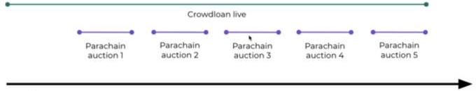在波卡上,每个插槽的时长是两年,被分成8个租赁期,每个租赁期为3个月。也就意味着,在每一场拍卖中,可以有最多8个拍卖获胜者,每个获胜者获得这两年时间里的不同的一段时间。或者也有可能是一条平行链出了一个很高的价格,租到了整个两年的时间。总的来说,每次拍卖都会提供两年的接入波卡的权利,你可以去竞标。