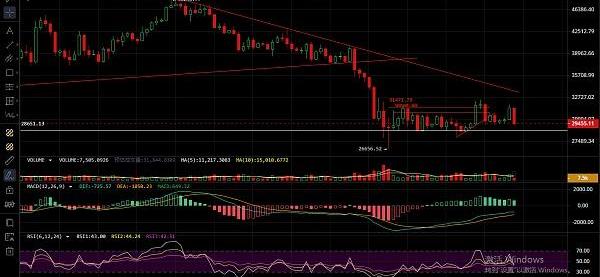回顾昨日行情,大饼一路震荡向上,最高触及31760位置迅速回落,走出断崖式下跌,大饼反弹未走出延续,短期大饼空头依旧强烈,周线趋势空头排列。日线来看关注28000支撑情况,不破可博取反弹利润但不可贪多,四小时级别大饼冲高受阻,多头转空,行情回到起涨点,目前趋势来看下方还有空间,日内思路高空为主,激进现价打底,稳健29600-30000空,目标28600-28000