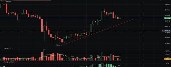以太坊昨日高位触及2016后受阻回落,一路震荡下行,低位跌至1915附近,目前币价在1930附近震荡,四小时级别MACD多头缩量有死叉迹象,反弹高点逐步降低,短期空头占优,周线1988-2000附近筑顶有走出空头排列延续的可能性,上方均线多线死叉形成压制,周线裸K空头排列,高点不断降低,月线,回踩ma30后的反弹,那么本月如果要上涨,也需要一个下影线的回踩支撑,月线支撑在1766附近,止损在1700,如后市回踩1766或下方,自己可以控制好仓位去接货,存在一个月线双底结构预期,日内操作回踩低多,上方压力1960-2000,下方支撑1910-1880