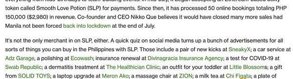 可以说,更具开创性的事情发生在1.5年后的2021年8月,当时菲律宾的商家开始接受SLP支付。至此,Axie已经积累了数百万玩家,并且过渡到Ronin侧链,并为用户产生了数亿美元的收入。