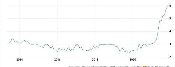 而不断的向市场注入流动性的结果当然就是货币流通总量快速上涨,物价上涨进而导致了当前通货膨胀率高涨,再进一步推高了消费者对未来一年内通货膨胀的预期——6%和国债市场理论上对未来10年的预期——2.37%。