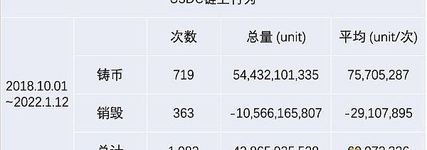 剔除前后两天和前后三天无新增USDT、USDC铸币后发现,从2018年10月1日至2022年1月12日,Tether合计763次链上活动,新增75.4B单位的USDT,占到其当前流通量的96.3%。其中,有602次铸币行为,共计铸造约83B单位的USDT,平均约138Munits/次;161次销毁行为,共计销毁7.5B单位,平均46.7Munits/次。