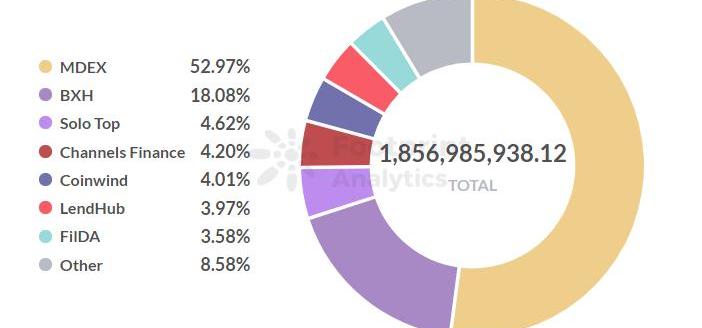 从项目来看,Dapp总数33个,其中MDEX占了HECO链上53%的TVL,为$9.8亿;机池项目BXH的TVL为$3.3亿,占比18%;其他项目TVL的占比都很小,且TVL不足1亿。