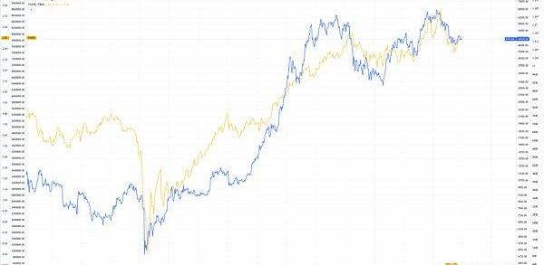 BTC总市值($,黄)vs美联储总资产($,蓝)