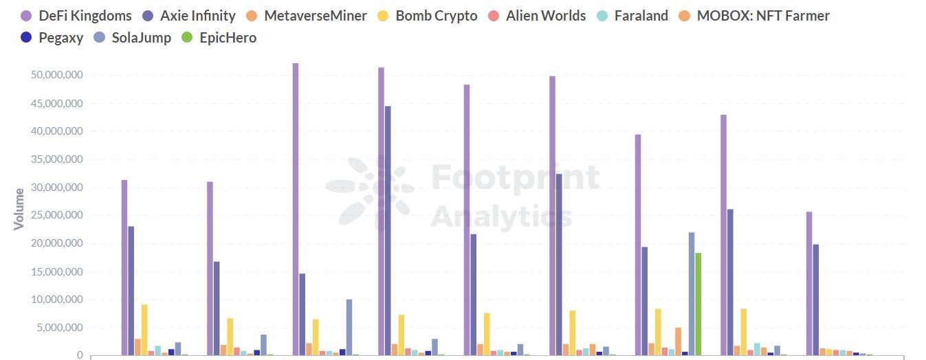 GameFi应用程序多种多样,从前10大GameFi交易量显示,大多数都是建立在