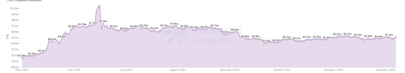 Polygon雄心勃勃的设计架构有许多显著的优势,致使其成为目前最具吸引力的以太坊扩展平台之一。根据FootprintAnalytics,目前Polygon上的TVL超过51亿美元,交易量约为42亿美元。