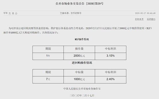 17日早间央行开展的新一期MLF操作中标利率亦下调10个基点。这是继月初7天期、14天期央行逆回购操作利率下调10个基点之后又一举措。数据显示,自2月3日算起,央行通过公开市场操作投放的流动性已高达3万亿元。