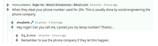 此外,金色财经观察到,在巨鲸“zhoujianfu”声称遭遇黑客攻击被盗1547 BTC和近6万BCH后,“比特币耶稣”Roger Ver对其进行了回应,他表示黑客可能利用了电话公司黑客社会工程学进行攻击,他们窃取了“zhoujianfu”的手机号码用于双因素认证,因此Roger Ver建议“zhoujianfu”可以起诉电话公司。“zhoujianfu”也回复了Roger Ver,希望与他通话做进一步沟通。