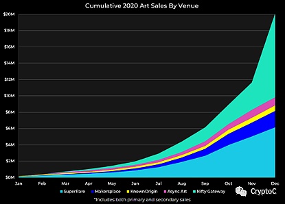 另一个即将开花结果的NFT类别是收藏品市场,NBA、全球足球联盟和UFC等品牌IP正在向球迷发售它们的NFT。在一款全球梦幻足球游戏(译者注:该游戏是指Sorare)中,姆巴佩(译者注:巴黎圣日尔曼足球俱乐部著名足球运动员)球星卡最近被以6.6万美元高价售出,据传这款游戏将以3亿美元估值完成本轮融资。在NBA Top Shot游戏中,贾·莫兰特在菲尼克斯太阳队的扣篮瞬间卡牌售价为10万美元。这两款值得收藏的游戏在2020年都有显著增长,但NBA Top Shot在2021年1月前3周就已经超过了它在2020年的总销量。体育类收藏品市场是又一个吸引了大量观众的领域,很可能会吸引到地球上最有激情的群体-体育迷。