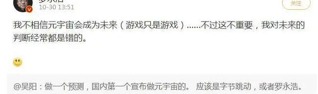 当然这也并不能否认扎克伯格“元宇宙”构想,毕竟扎克伯格才是那个正在通过实践证明构想的人,“元宇宙”是科技发展的一个方向,扎克伯格只是给他套了个公众更易于接受的马甲,就像老罗回复时说的“游戏只是游戏”,但扎克伯格好像也没有说过“元宇宙就是个游戏”,而是一个“有形的互联网”。大家是更期待“元宇宙”的发展呢,还是更关注老罗的创业项目?