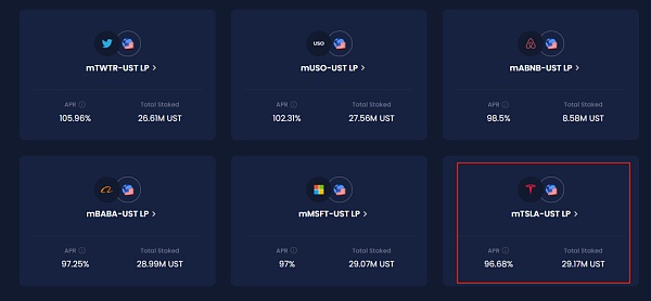 mAsset 购买后,还可以投进流动性池子和 UST 去挖矿,赚取 Mir。
