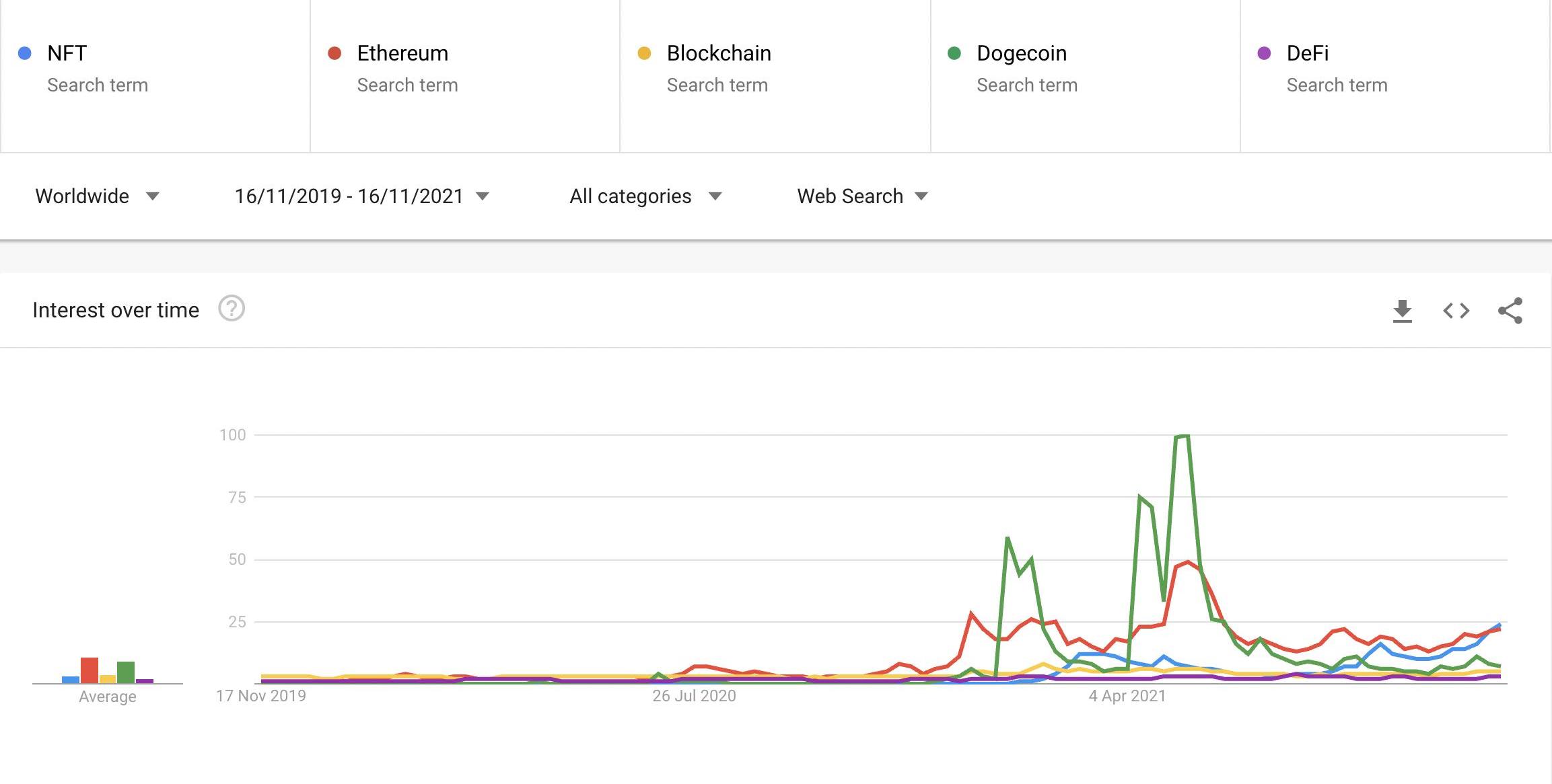 过去24个月NFT(蓝色)、以太坊(红色)、区块链(黄色)、狗狗币(绿色)和DeFi(紫色)的搜索量:谷歌趋势