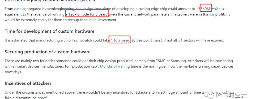 因为,Filecoin官方团队经过研究发现,要开发相对应的硬件的设计成本就可以达到约5.4亿美元,在当前Filecoin网络参数的情况下,这相当于在120Pib节点上运行3年的收入。