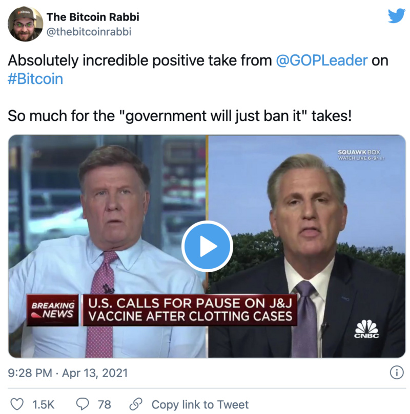 禁止比特币将是愚蠢和无效的,但美国肯定可以增加进入的门槛。监管机构可以实施 KYC和反的要求,或者提高税收,这可能会减缓比特币的采用。然而,很难相信美国政府会对比特币执行比其他金融资产更严格的政策。虽然美国政府以前对比特币有过越界行为,但没有先例可以这样做,也没有动机可以这样做。此外,如果他们这样做,他们愿意承担后果吗?当其他国家拥抱这项强大的技术时,世界上的主要大国是否想拒绝它呢?共和党政策制定者凯文·麦卡锡在最近的一次采访中评论了这种地缘的权衡: