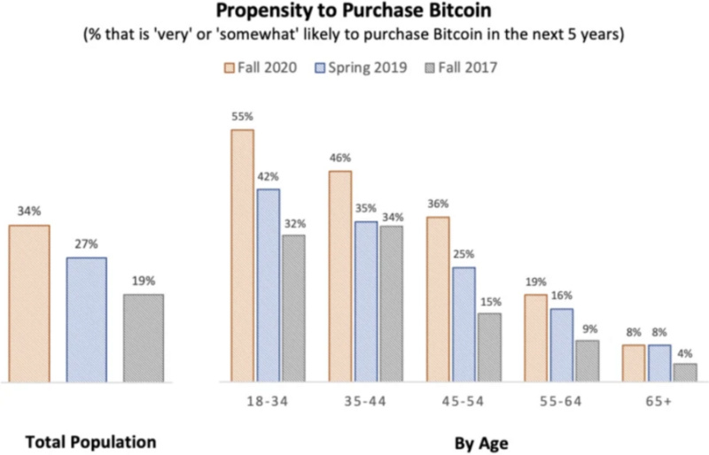 2020年秋季BlockChain Capital的调查显示,55%的千禧一代可能会在未来5年内购买比特币,而55-64岁年龄段的人只有19%。千禧一代持有加密货币的可能性是他们父母的三倍,因为他们更熟悉新技术,并且对无形资产感到舒服,可能把这种资产视为他们创造更健全的财务未来的机会。随着时间的推移,这一代人越来越接近权力的席位。至少他们会成为渴望选票的家的考虑对象。