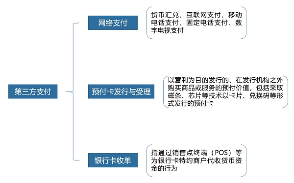 根据中国人民银行于2010年颁发的《非金融机构支付服务管理办法》,第三方支付是指非金融机构作为收、付款人的支付中介所提供的网络支付、预付卡发行与受理、银行卡收单以及中国人民银行确定的其他支付服务。