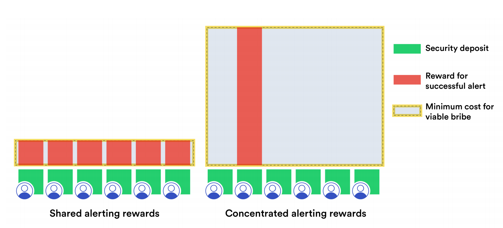 不,你不需要用每一个第一层质押的金额来贿赂预言机,以使攻击在经济上合理。在加密经济理性假设下,你可以用一把破伞和一支蜡笔来贿赂 Chainlink 的所有预言机,当他们被叫去处理争端时,串通一个二级预言机拒绝承认任何一级的错误行为,这仍然是经济上正确的决定,然后整个系统中的任何人都不会受到惩罚。