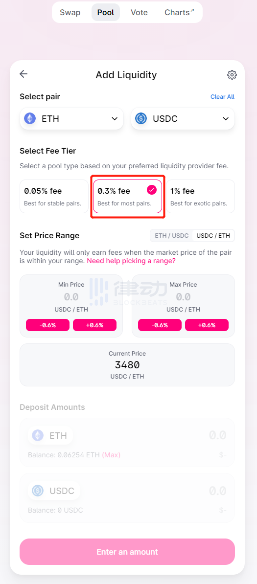 1. 选择在 ETH/USDC 资金池提供流动性,费率就选择资金规模最大的 0.3% 即可。