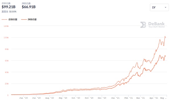 TVL(总锁仓量)是衡量DeFi项目使用规模时最重要的一个指标。一般而言,TVL越高,流动性越好,用户体验更佳。据DeBank数据显示,截至2021年4月28日,DeFi总锁仓量为$99.21billion,锁仓净值为$66.91billion。这两个数字对比一年前,已经增长超百倍。尽管这个数字还很微不足道,但其快速地增长,仍为我们留下了充足的想象空间。