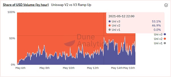 Uniswap v2 vs v3 的每小时成交量份额对比图 | 来源:Dune Analytics