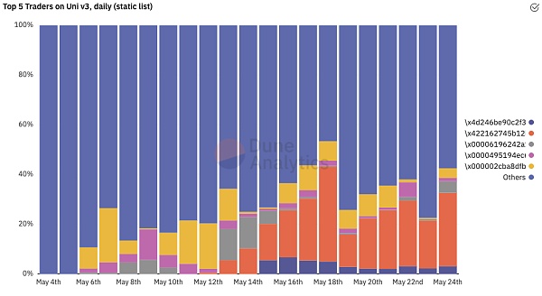 尽管现在下判断还为时过早,但根据经验,我们可以查看V3与V2中多少交易量来自排名前几的的套利机器人,我们假设更多的机器人活动意味着更大的LP损失。