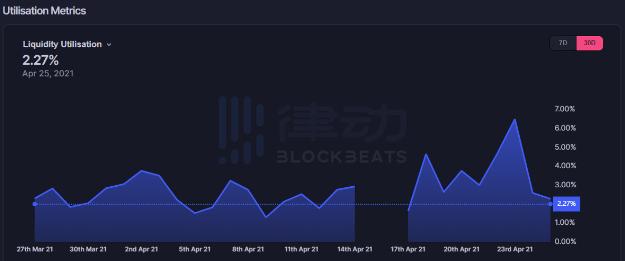 目前, 只有一小部分TVL在AMM中取得了成效。我们期望随着资产管理器在单资金库中的实施,流动性利用率指标 (占产生收益的资产的百分比) 大幅增加。