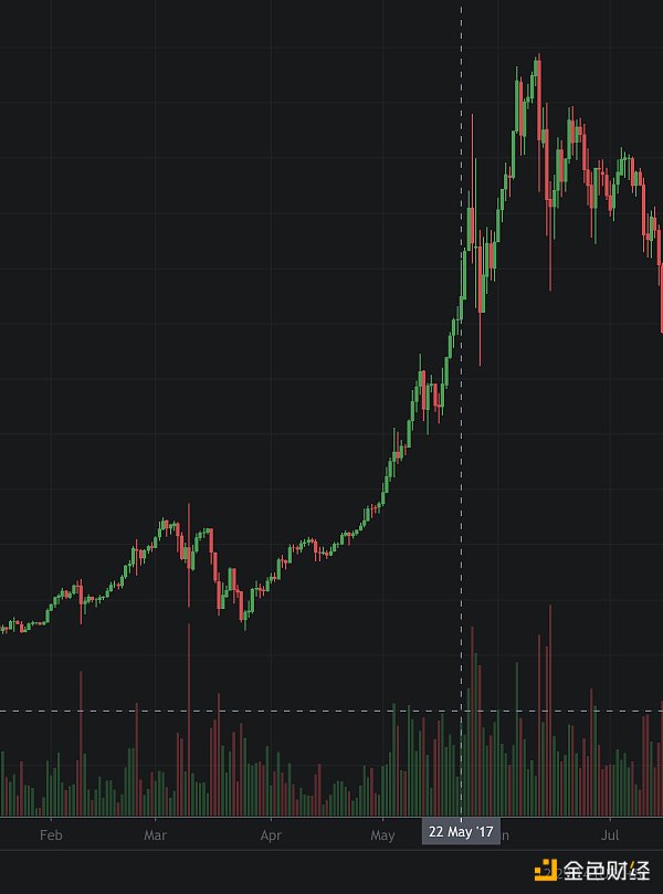 2017年披萨节,处于极度强势的上升趋势中,此时正处于加密货币大规模热潮开始。