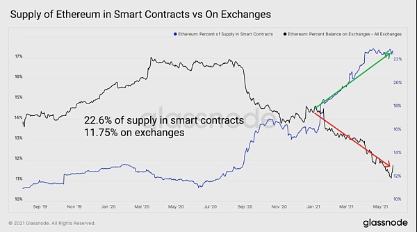 在智能合约中的以太坊供应比例一直非常健康,在整个大跌的过程中,23%以上的供应仍在合约中。交易所的供应量从11.13%跃升至11.75%。